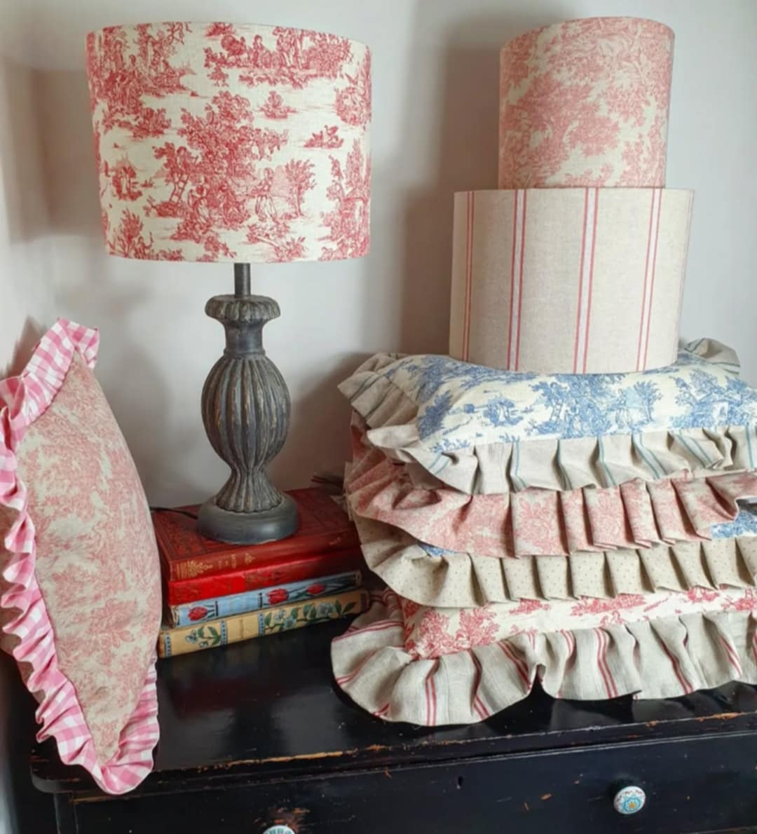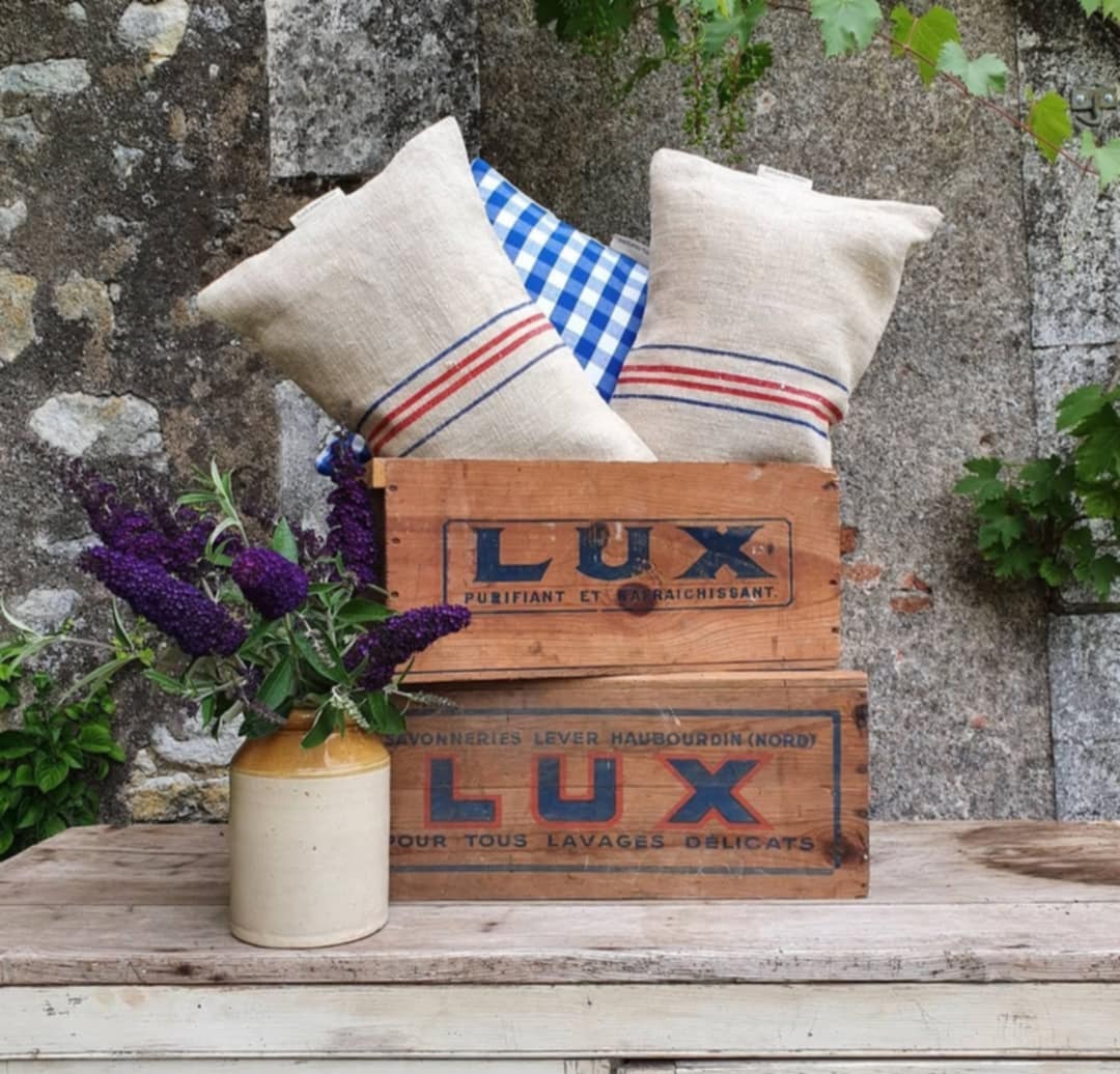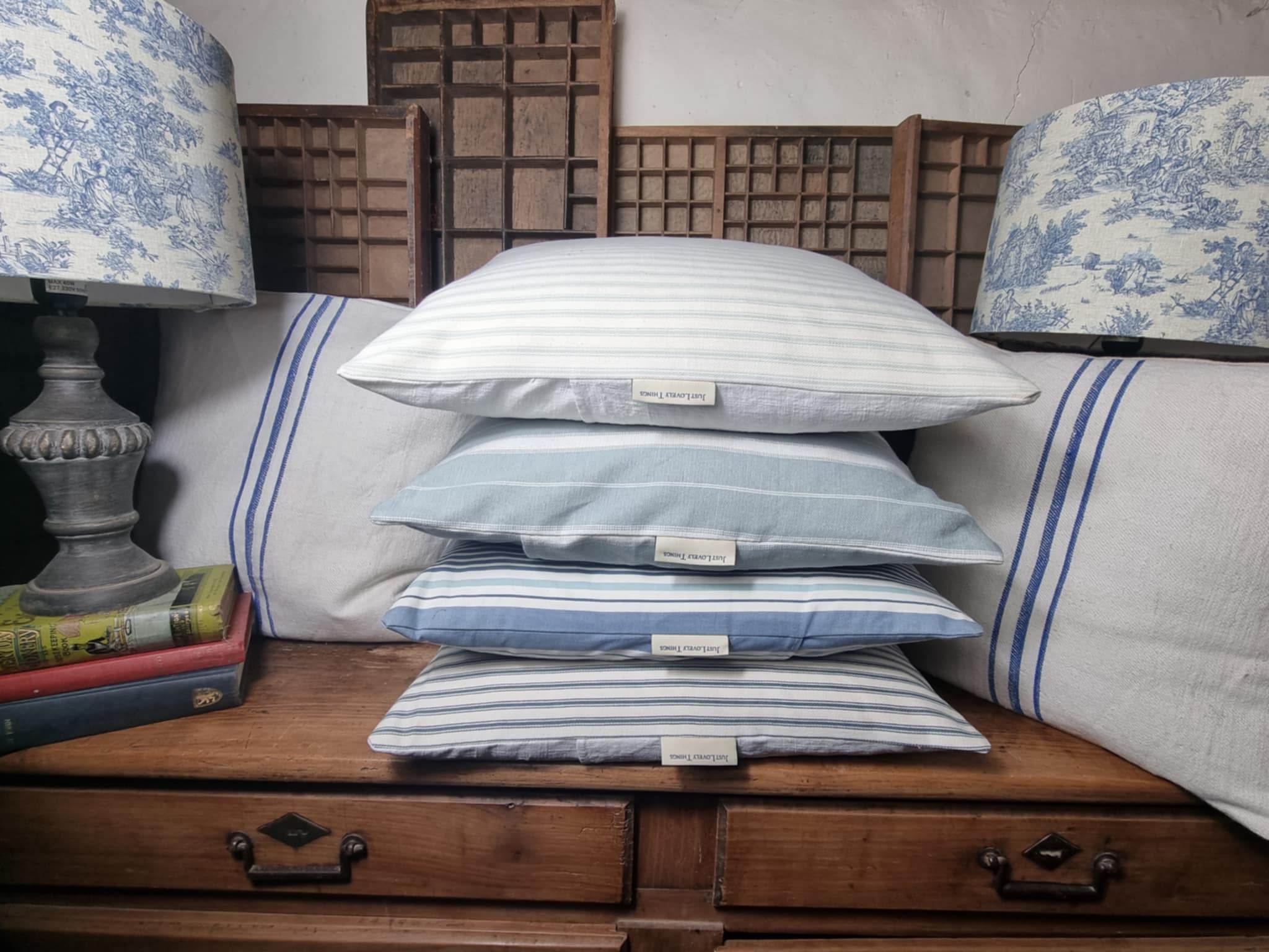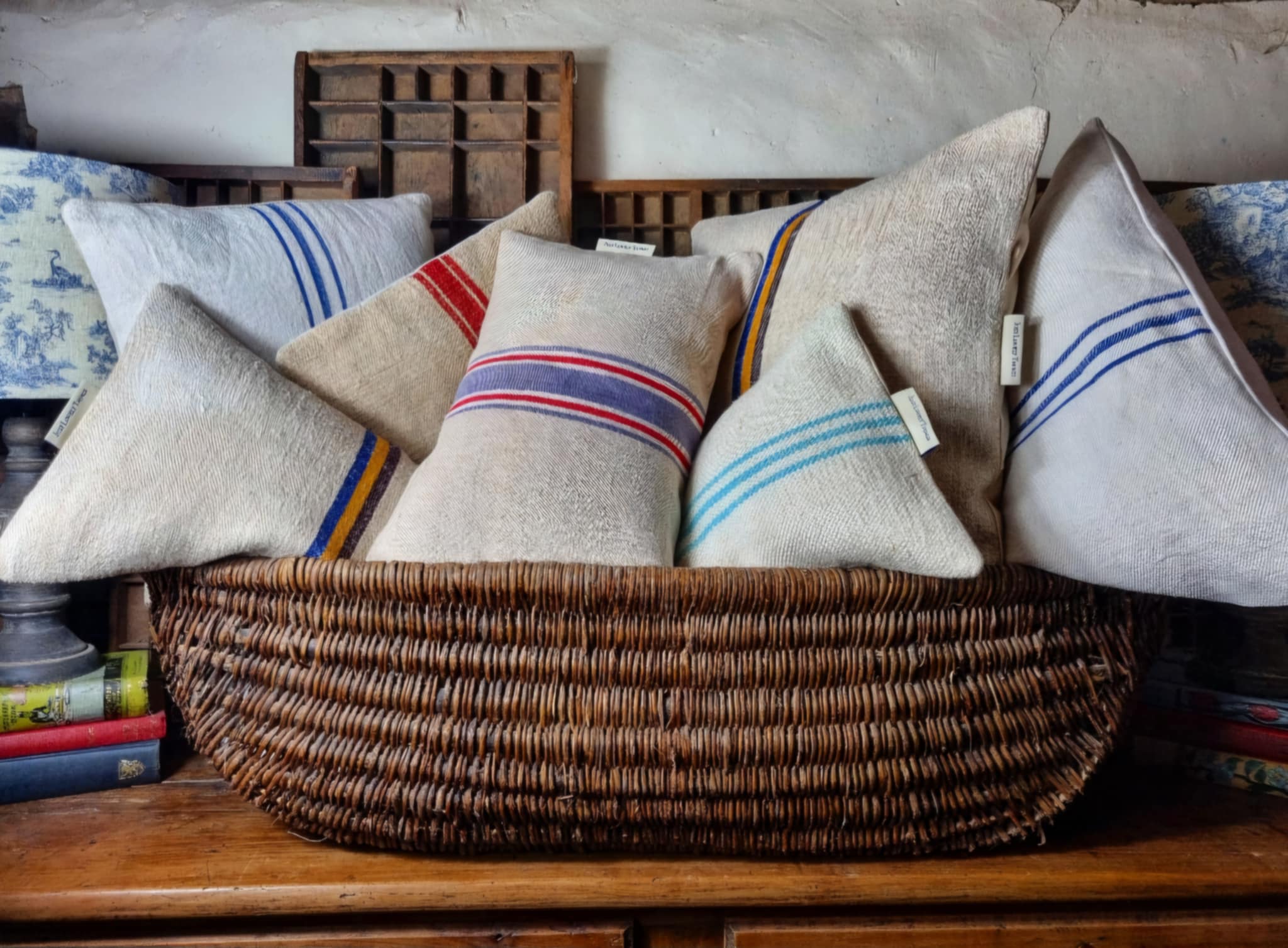 I have been making cushions for over 30 years now & am inspired by the unique & exceptional quality of Vintage fabrics, It’s very special to know that your sofa cushions were once a pair of curtains, gracing the windows of a château or a vintage Hungarian grainsack. I have a range of in stock items or I can make any size or design to order.